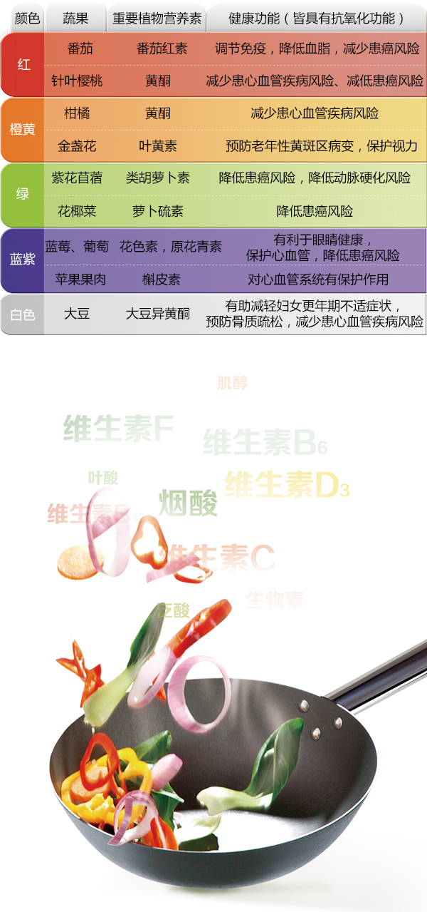 植物营养素蕴藏在五颜六色的水果、蔬菜中,为了多元化地补充植物营养,应均衡摄取红、橙黄、绿、蓝紫、白等五种不同颜色的蔬果和谷类,即“彩虹摄取原则”。