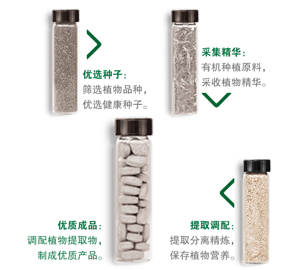 原料植物经过纽崔莱独特处理程序,最后制成的含有众多天然植物成分的粉末(植物提取物)会被添加到纽崔莱产品中,保证纽崔莱产品富含大自然所赋予的营养精华。