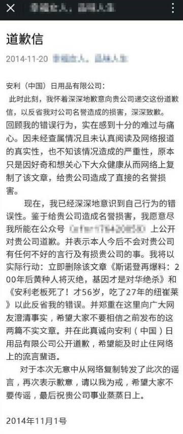 近年来,针对安利的谣言层出不穷,公司为此积极借助法律等渠道维权,对多起恶意造谣行为进行起诉。2014年,微信公众号“幸福**”因刊登《安利纽崔莱蛋白粉使用转基因大豆》等两篇谣言文章,其账号运营者被安利公司告上法庭。最后,账号运营者不仅要将谣言文章删除,还需在其微信公众账号发布道歉信4个月。