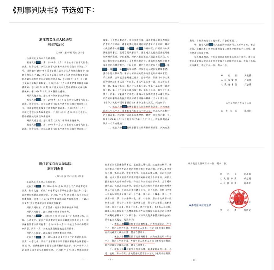 据判决书显示,今年6月和8月,浙江省义乌市人民法院分别对“义乌组织生产、销售假冒安利牙膏案”的16名犯罪嫌疑人完成了案件审理并依法做出宣判,依法对徐某等9名犯罪嫌疑人分别判处一年十个月到三年二个月不等的有期徒刑(缓刑三年至四年),并处罚金共计人民币125万元。主犯徐某被判有期徒刑三年二个月,立即执行,并处罚金人民币24万元。