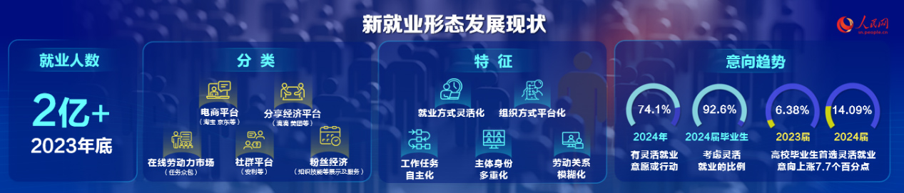 目前,我国灵活就业人口已达2亿人,占全国人口的14.3%。《报告》显示,2024年就业市场中,74.1%的人群有灵活就业意愿或行动,今年高校毕业生灵活就业意向,同比上涨7.7%。张成刚说,新就业形态的发展,是就业领域的新质生产力,为劳动力市场发展提供新动力。