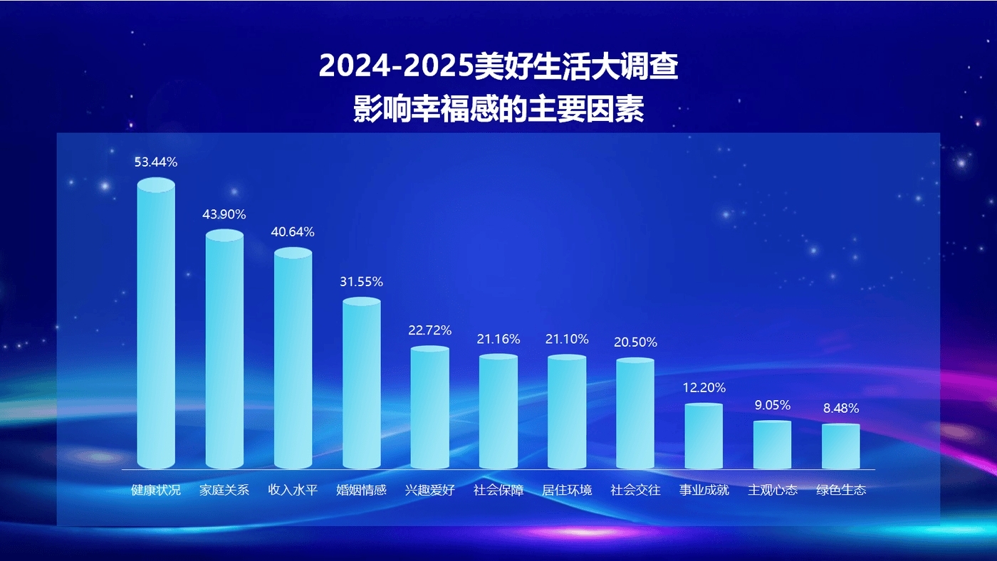 2024至2025年度大调查,覆盖全国31个省市自治区、150多个城市、近300个县、覆盖10万家庭,调查颗粒度更细、维度更丰富,聚焦消费热力、健康动力、乐业活力和幸福给力等维度,勾勒国民美好生活的砝码变迁。大调查显示,2024年,健康状况(53.44%)、家庭关系(43.90%)、收入水平(40.64%)、婚姻情感(31.55%)、兴趣爱好(22.72%),成为影响国民幸福感的五大核心要素。值得注意的是,收入对幸福感的影响正逐渐减弱,认为收入水平影响幸福感的受访者占比,已从2019年65.74%下降至2024年40.64%。