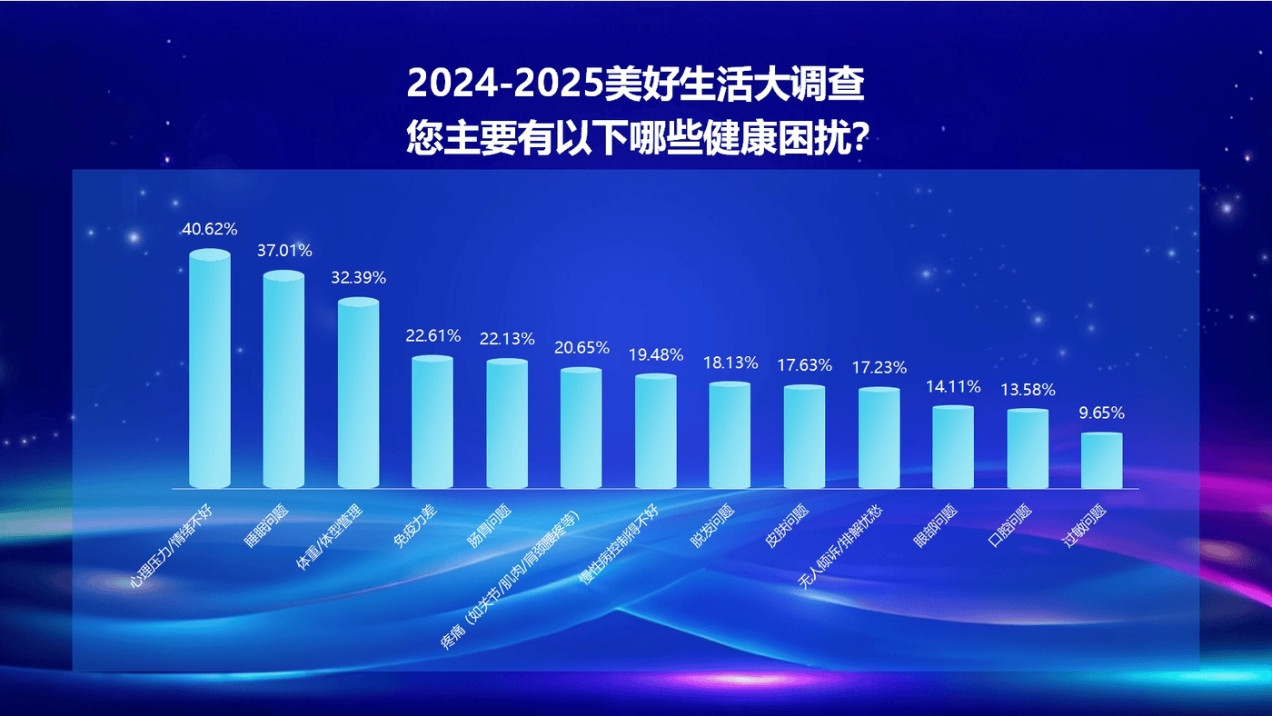 今年大调查发现,健康成为影响公众幸福感的首要因素。其中,心理压力/情绪不好(40.62%)、睡眠问题(37.01%)、体重/体型管理(32.39%)、免疫力差(22.61%)、肠胃问题(22.13%)是当前国民最关注的健康议题。